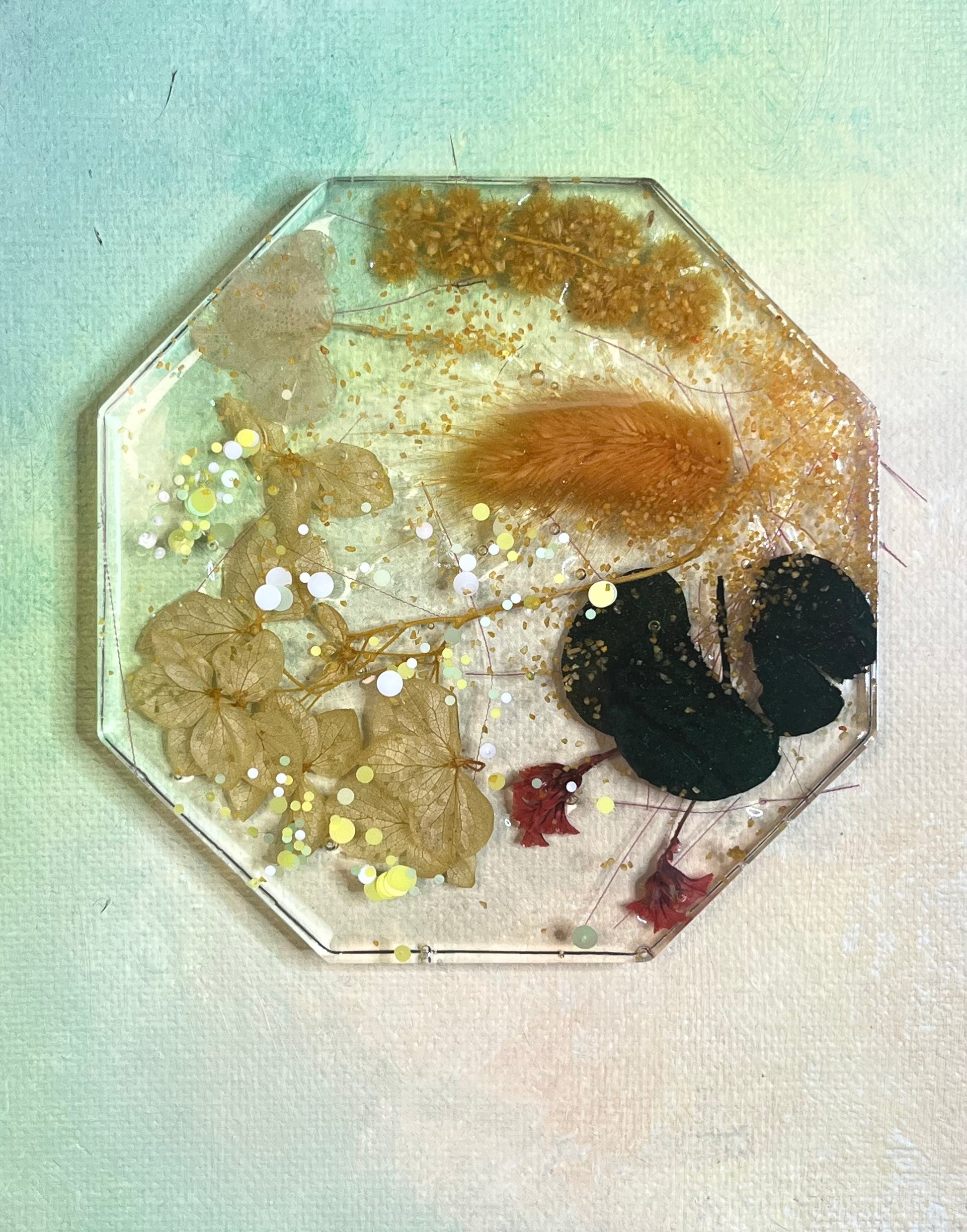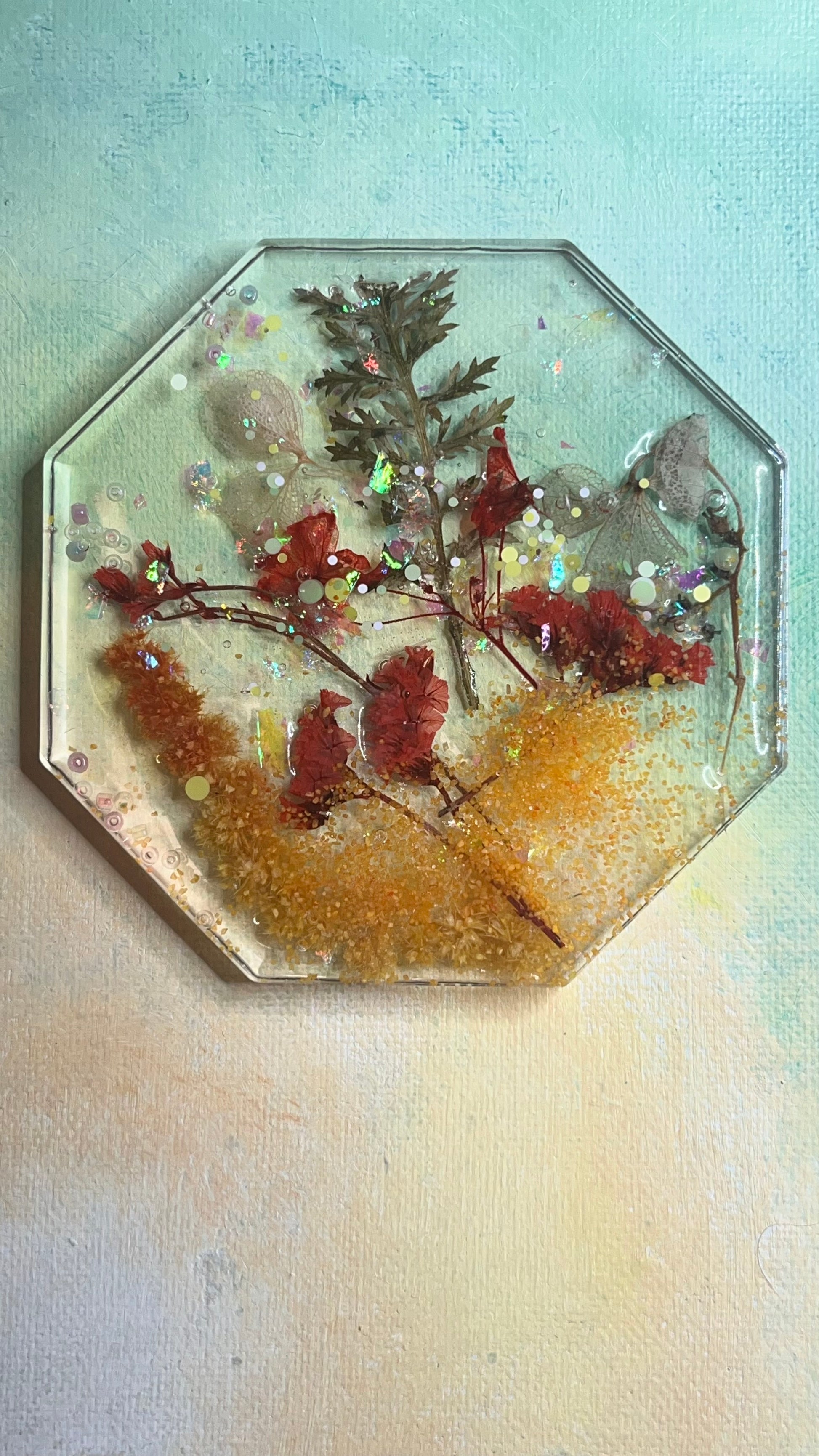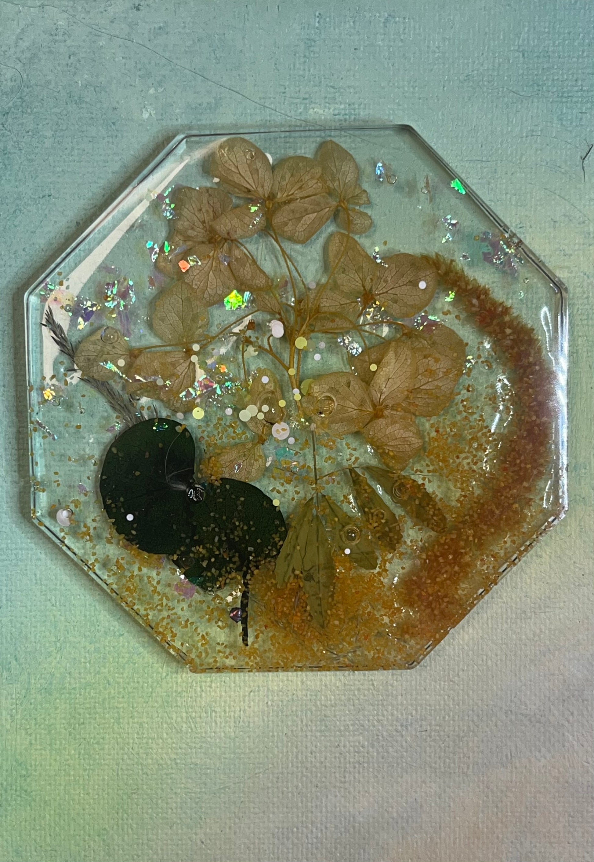 Upeat lasin- ja kynttilän aluset. Koristelussa käytetty itse kuivatettuja kukkia ja heiniä. Myös helmiä ja hileitä.