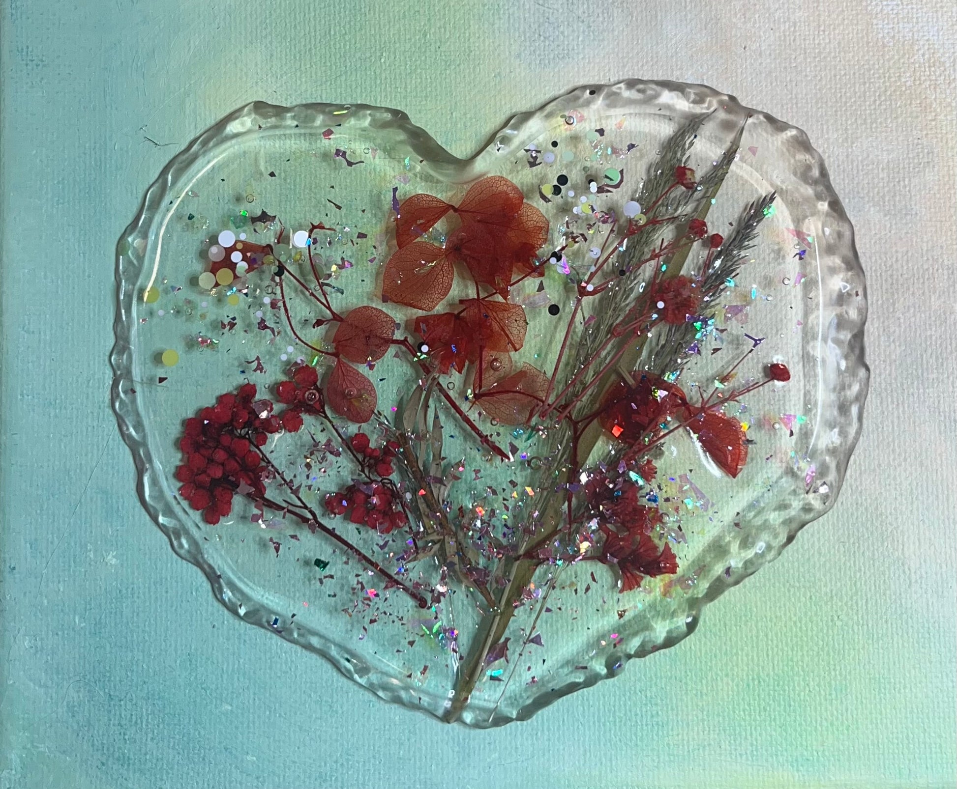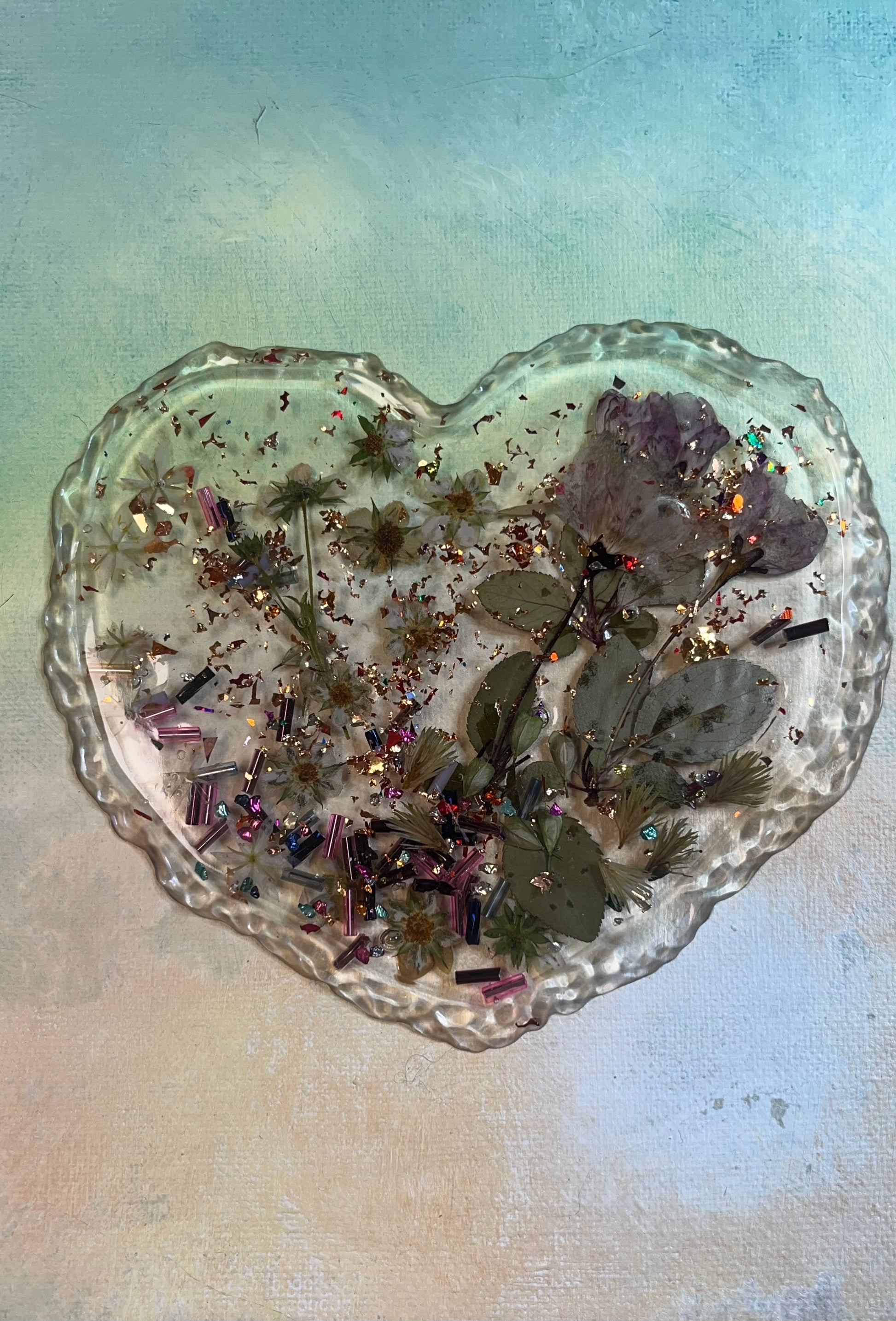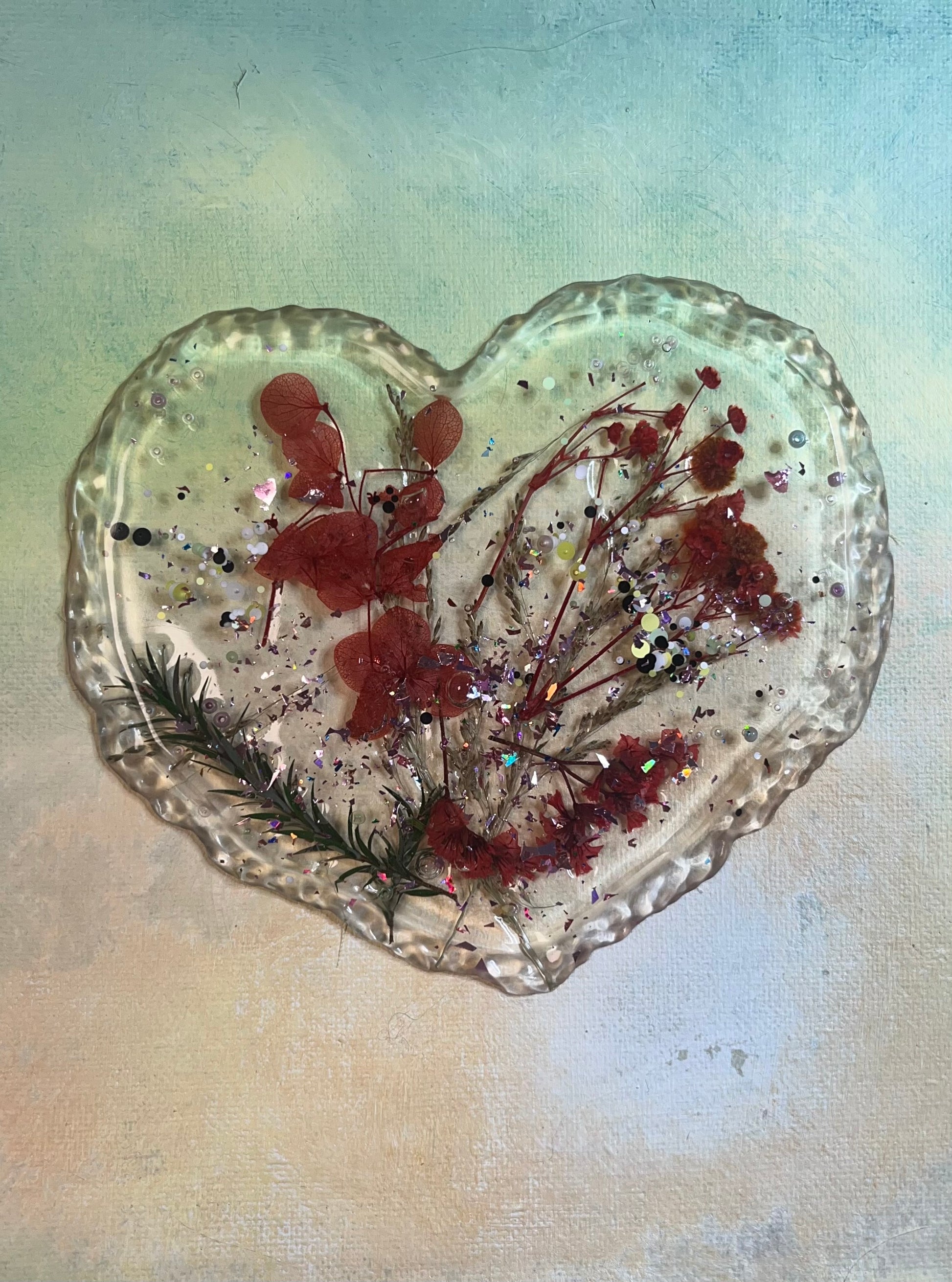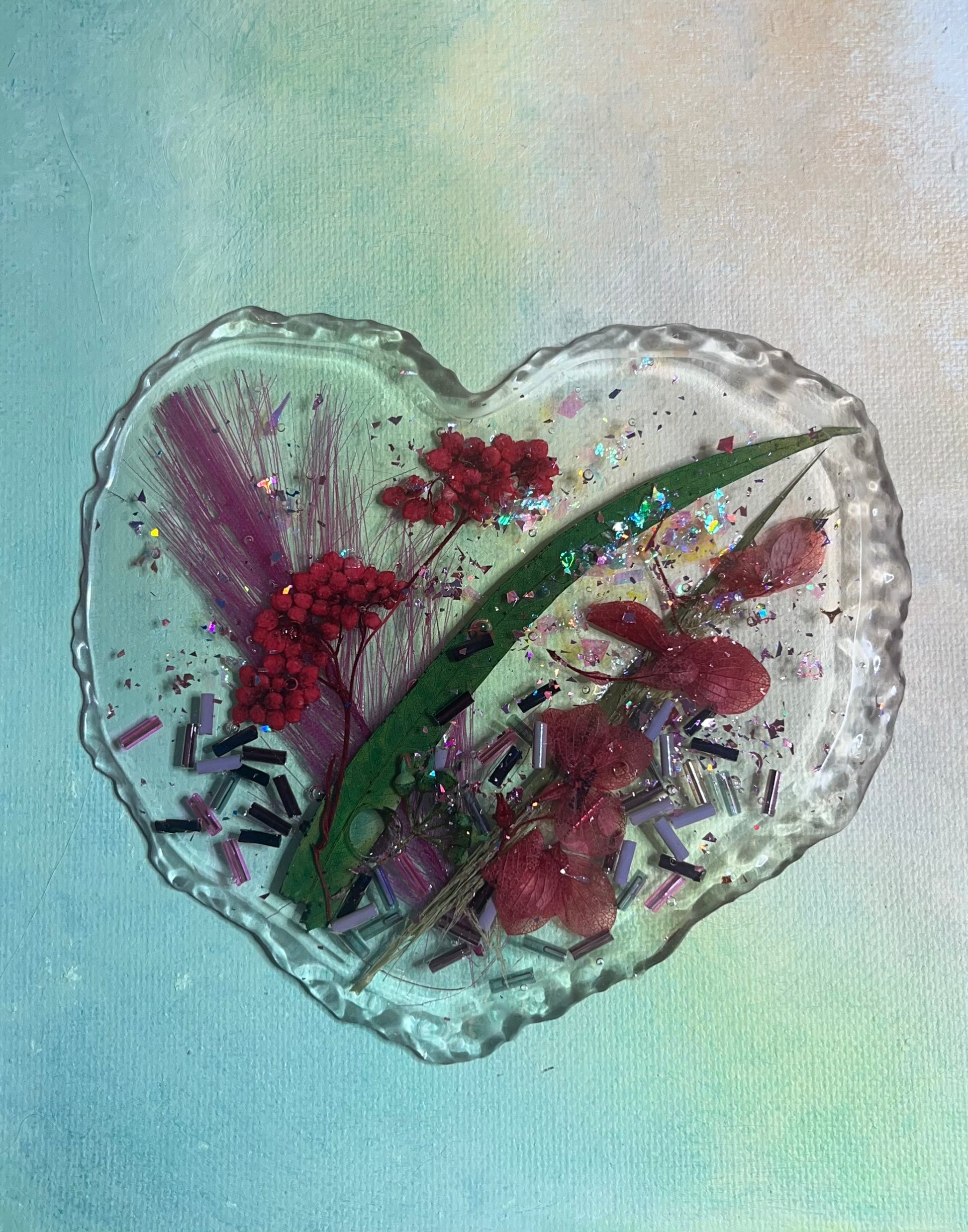 Kauniita lasin- tai kynttilän alusia. Kuivakukilla, helmillä ja hileillä koristeltuja.