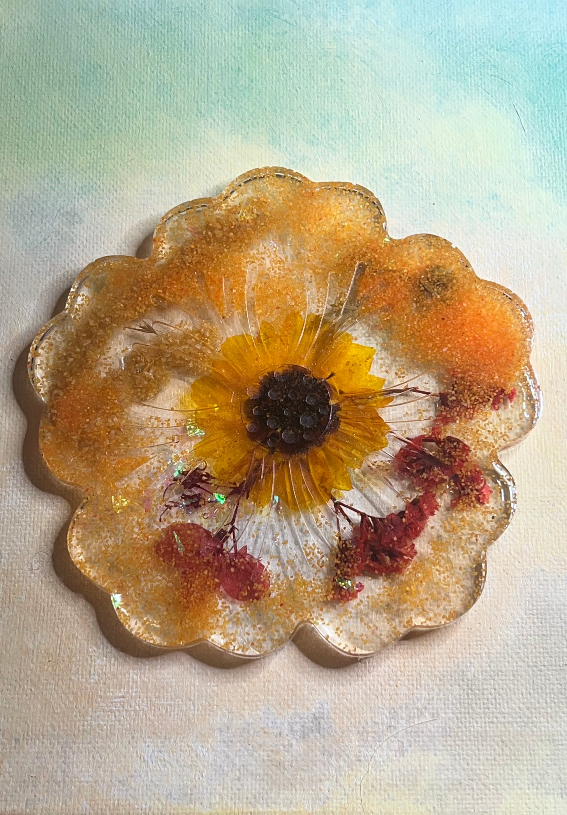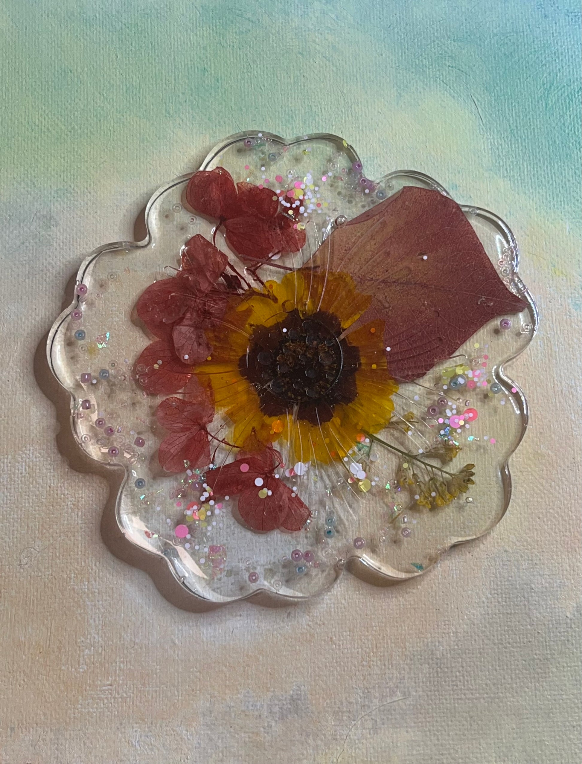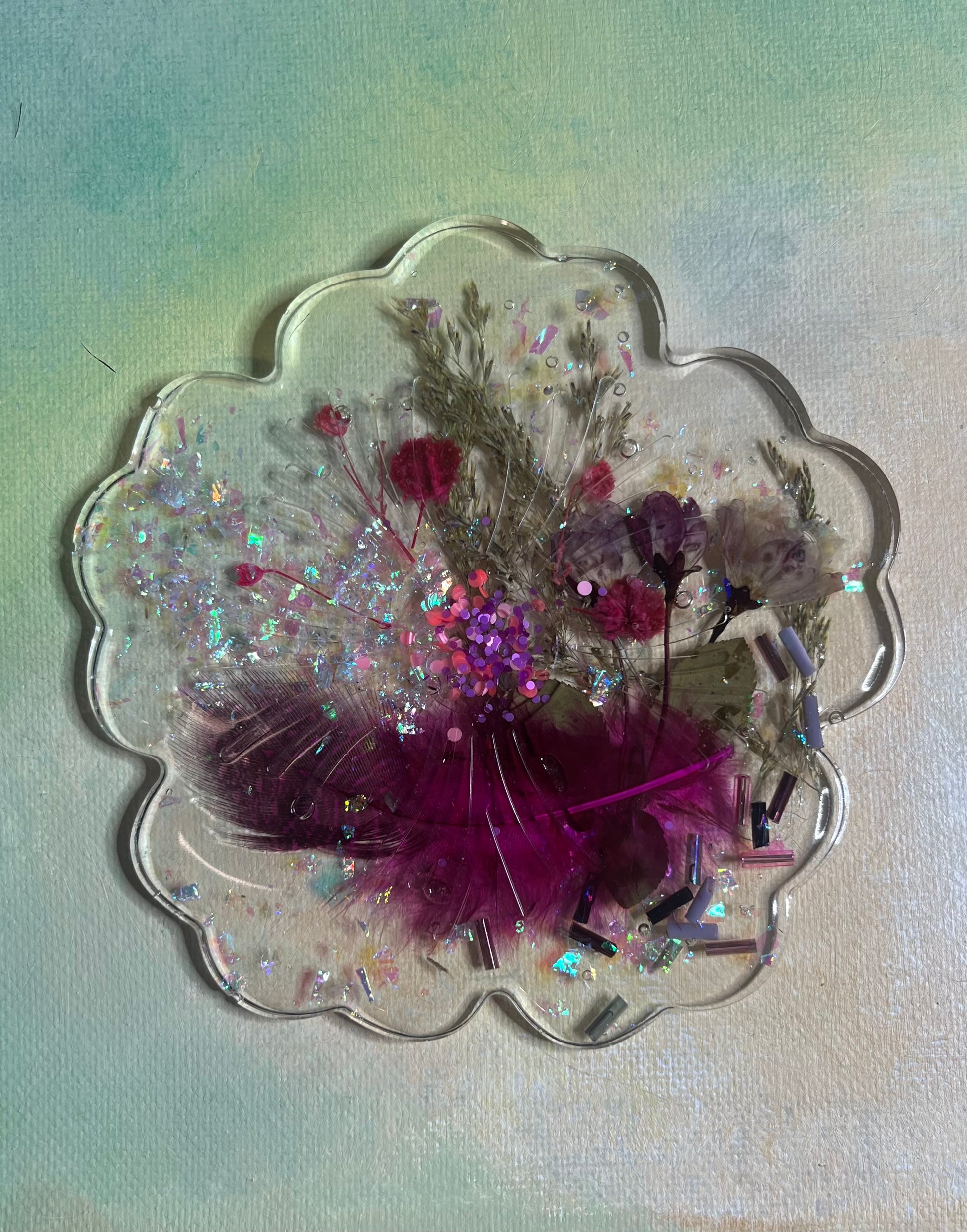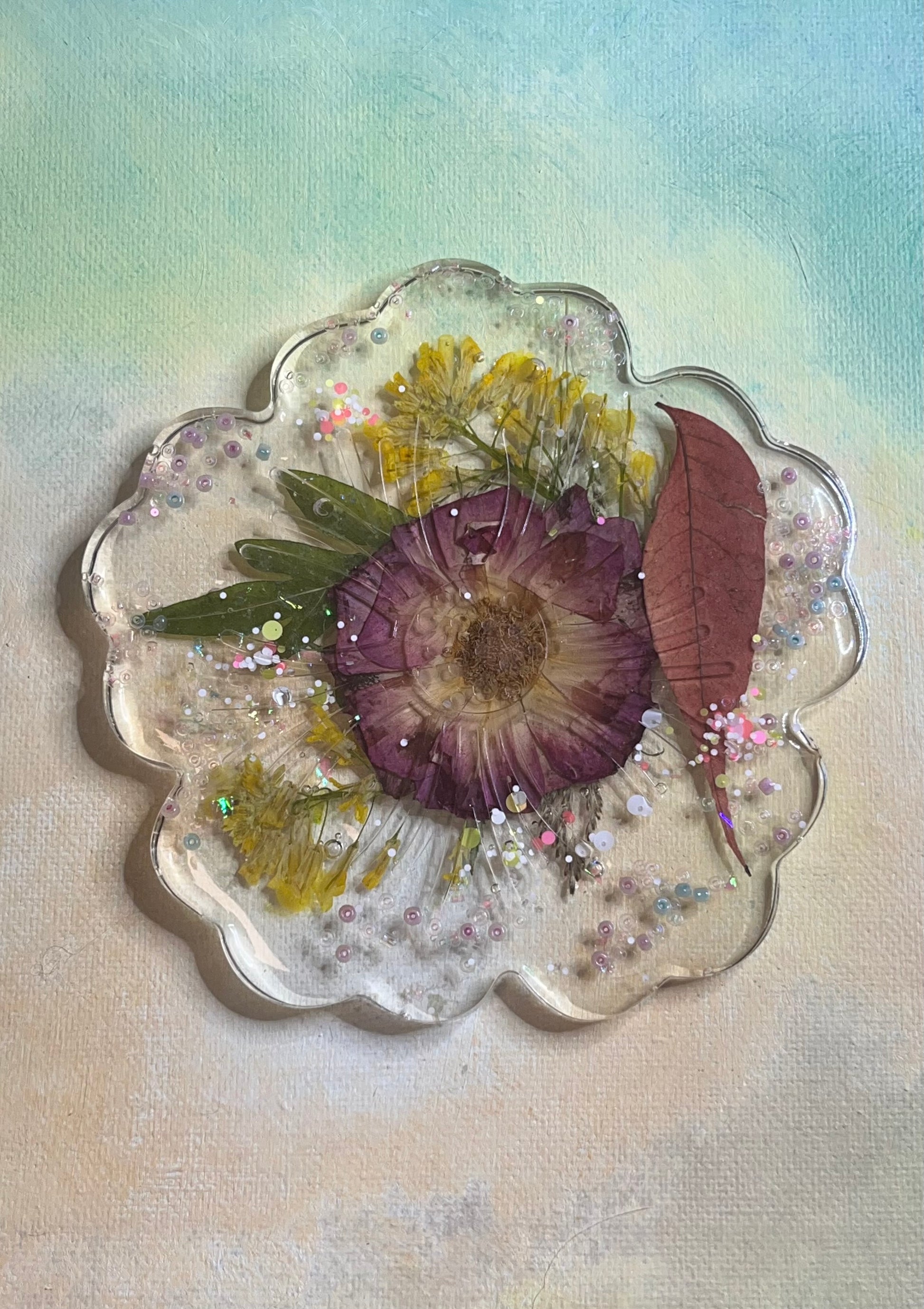 Upeita lasin- tai kynttilänalusia. Koristeena itse kuivatettuja kukkia, heiniä, helmiä, hileitä.