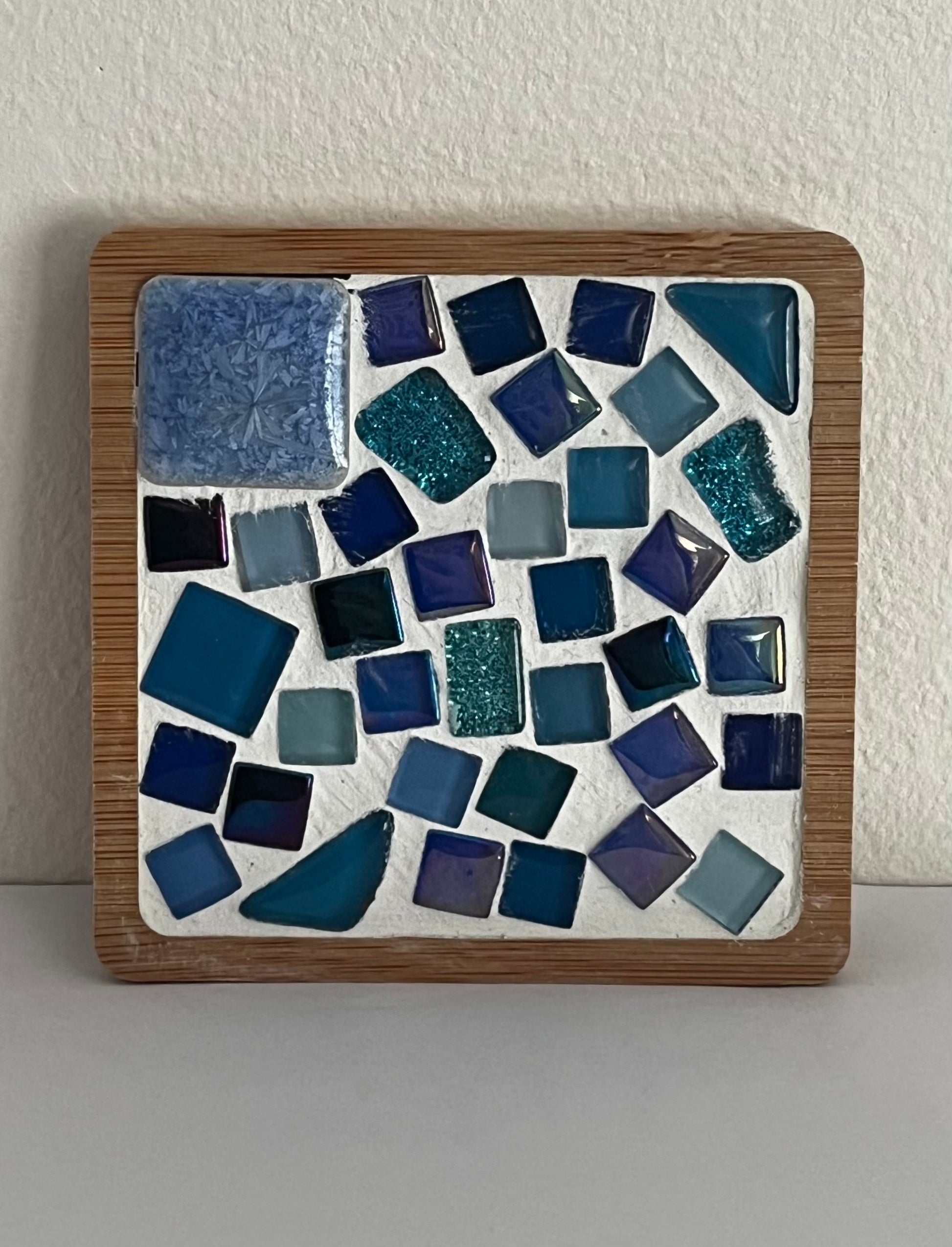 Upeista mosaiikeista tehty kauniita mukin- tai kynttilän alusia. Muoto vaihtelee, samoin värit.
