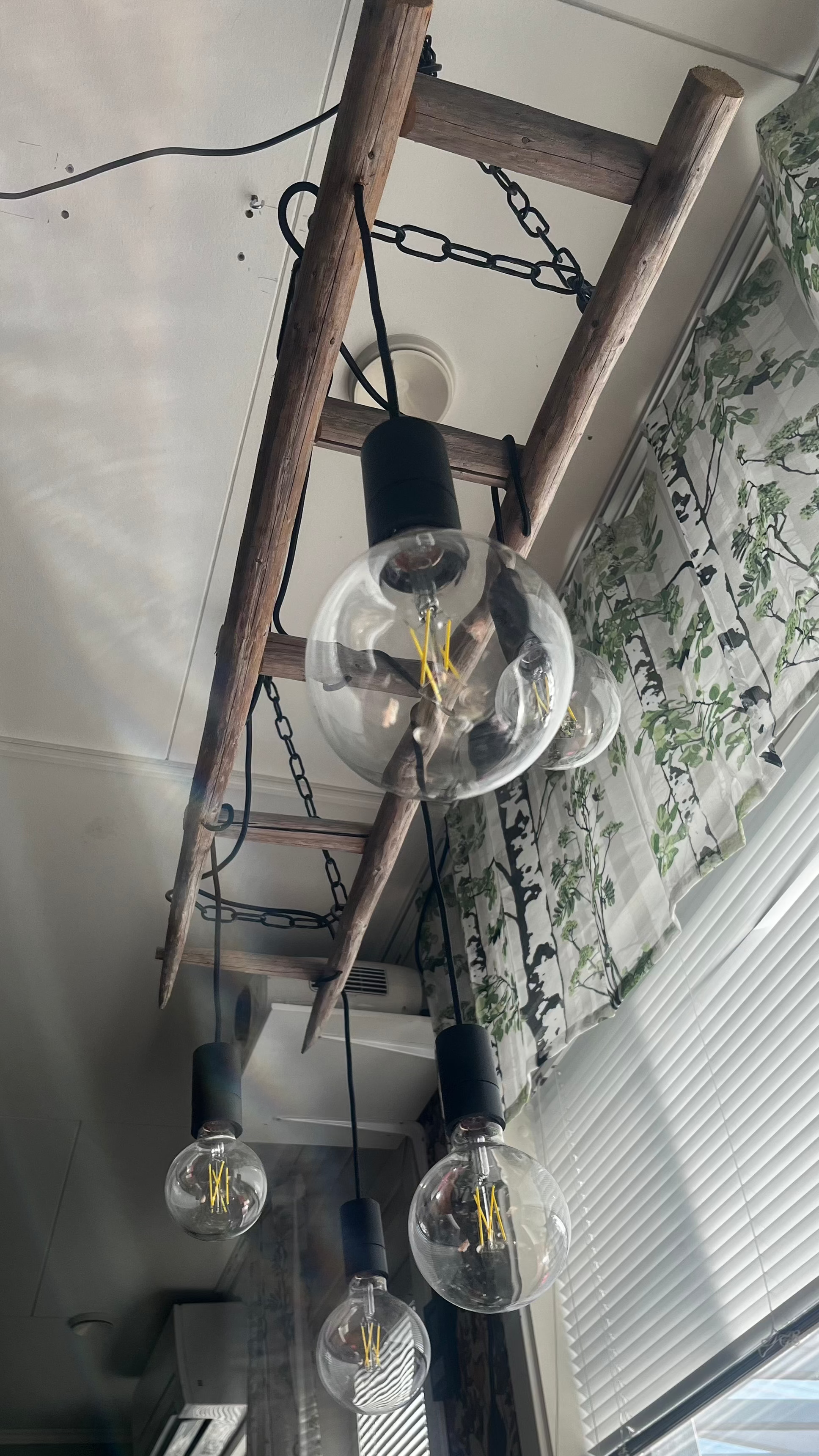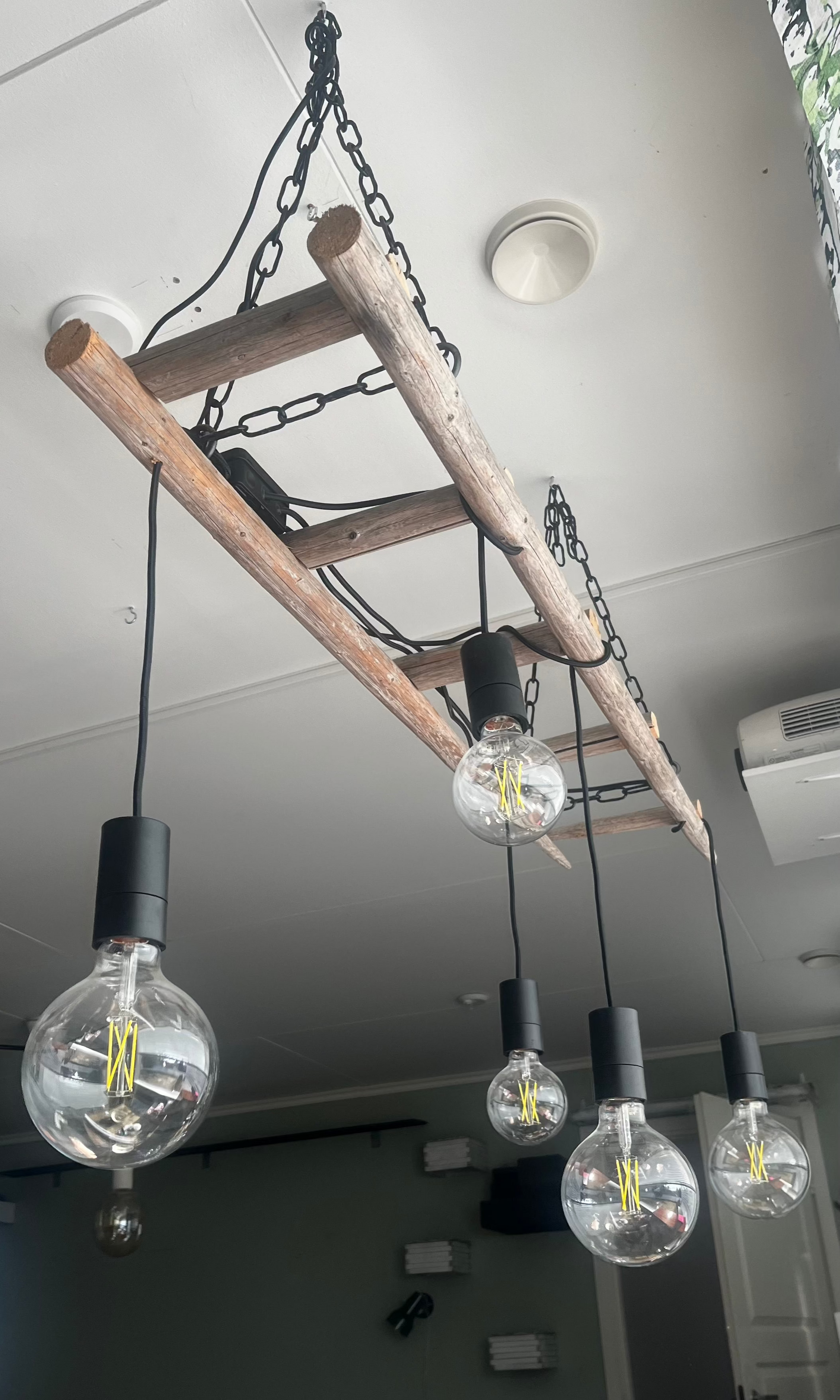 Heinäseipäästä tehty valaisin, 5 lampulla, jotka erikokoisia. Kattoon kiinnitys ketjuilla.